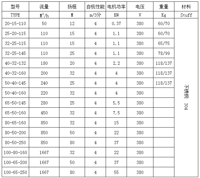 4、被输送的介质及其温度应在泵材允许的范围内(详见附表),金属泵的使用温度<100℃,被输送的介质比重≤1.3;介质比重大于1.3时,将影响自吸性能。