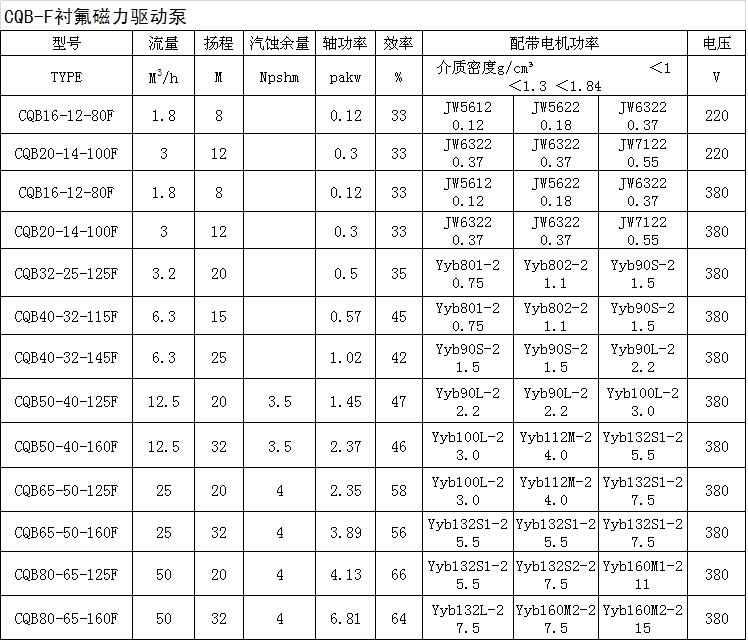 该泵以静密封取代动密封,使泵的过流部件处于密封状态,解决了其他泵机械密封无法避免的跑、冒、滴、漏之弊病,泵体及过流部件的材料采用了耐腐蚀的不锈钢、陶光、四氟石墨、碳石墨、硬质合金等材料制造,既有CQB型磁力驱动泵的功能,又集自吸于一身,不需底阀和引灌水,自吸高度4米。