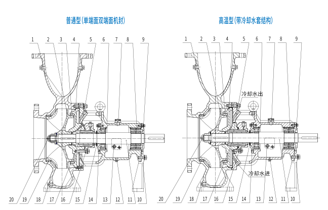 轴封:根据工况不同,可采用填料密封,单端面机封、双单面机封、串联机封等形式